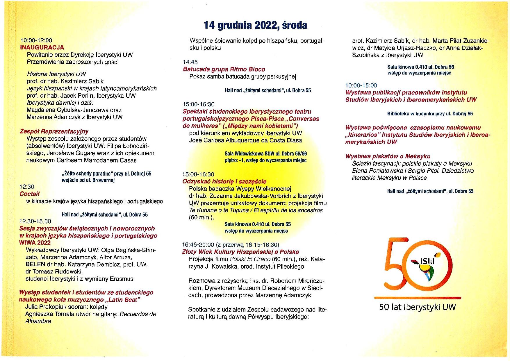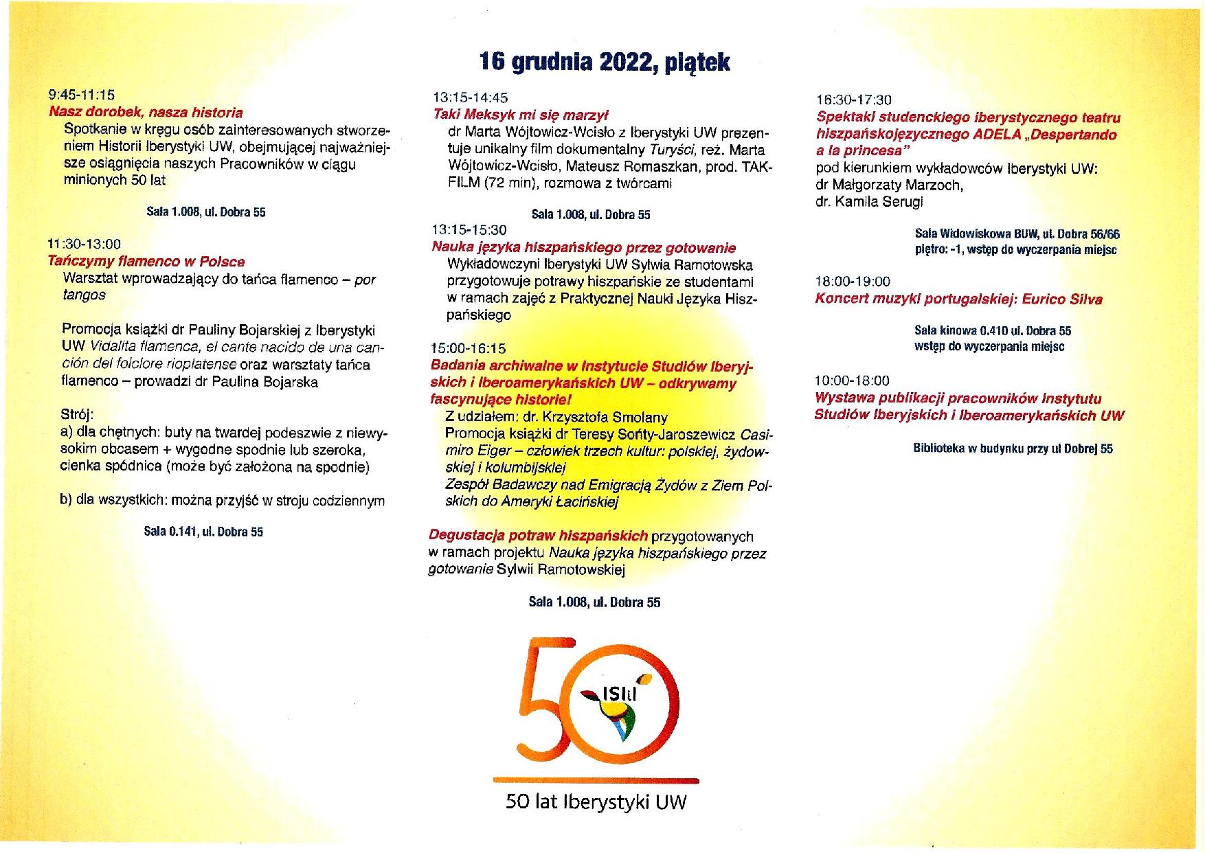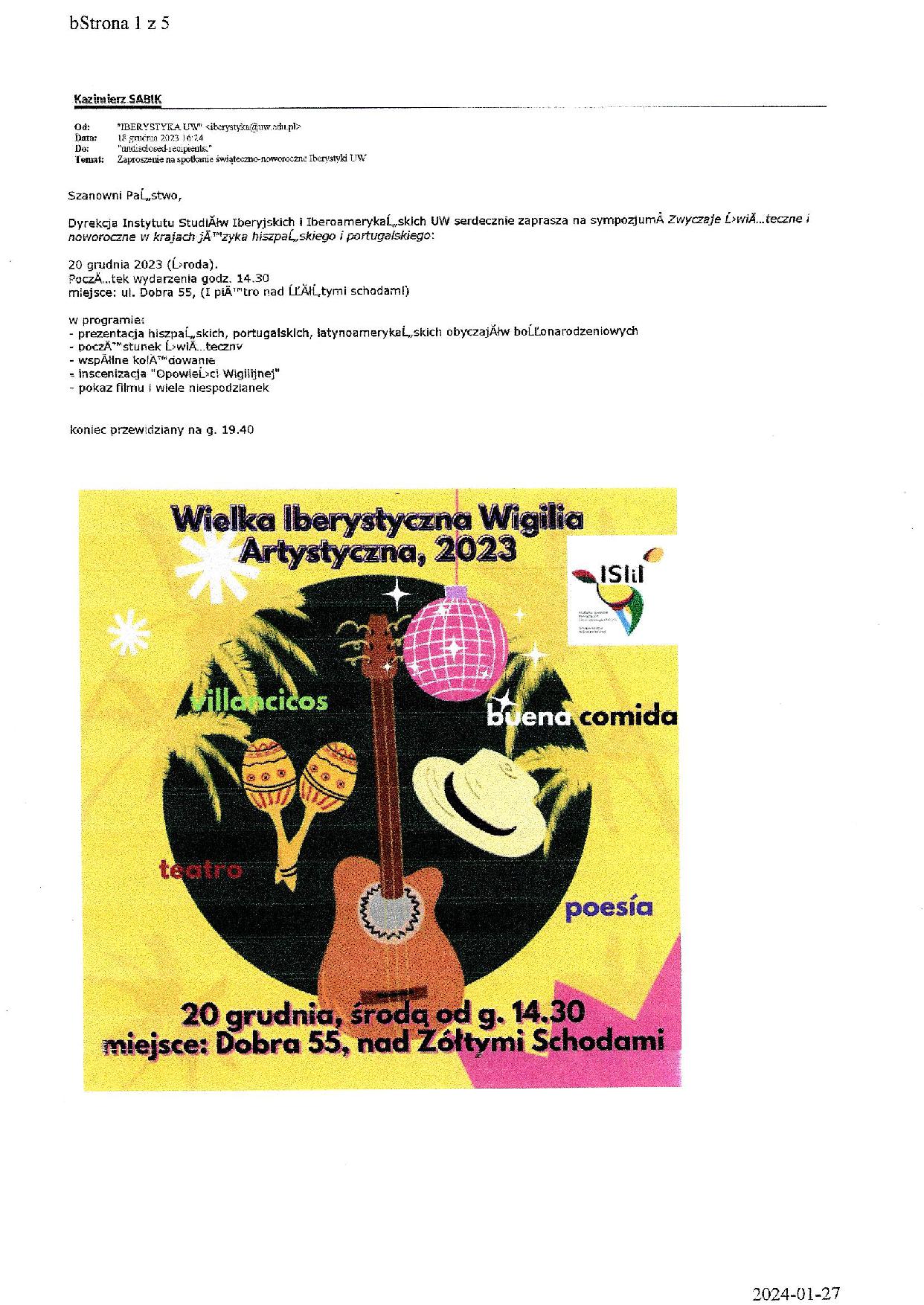 Następnie skok w najbliższe nam lata, a konkretnie 2023: impreza organizowana cyklicznie przez studentów w ramach działalności rozrywkowo-artystycznej, czyli Wielka Iberystyczna Wigilia Artystyczna, 2023, odbywająca się po raz pierwszy nie na ul. Oboźnej, lecz w nowej siedzibie Instytutu przy ul. Dobrej 55.