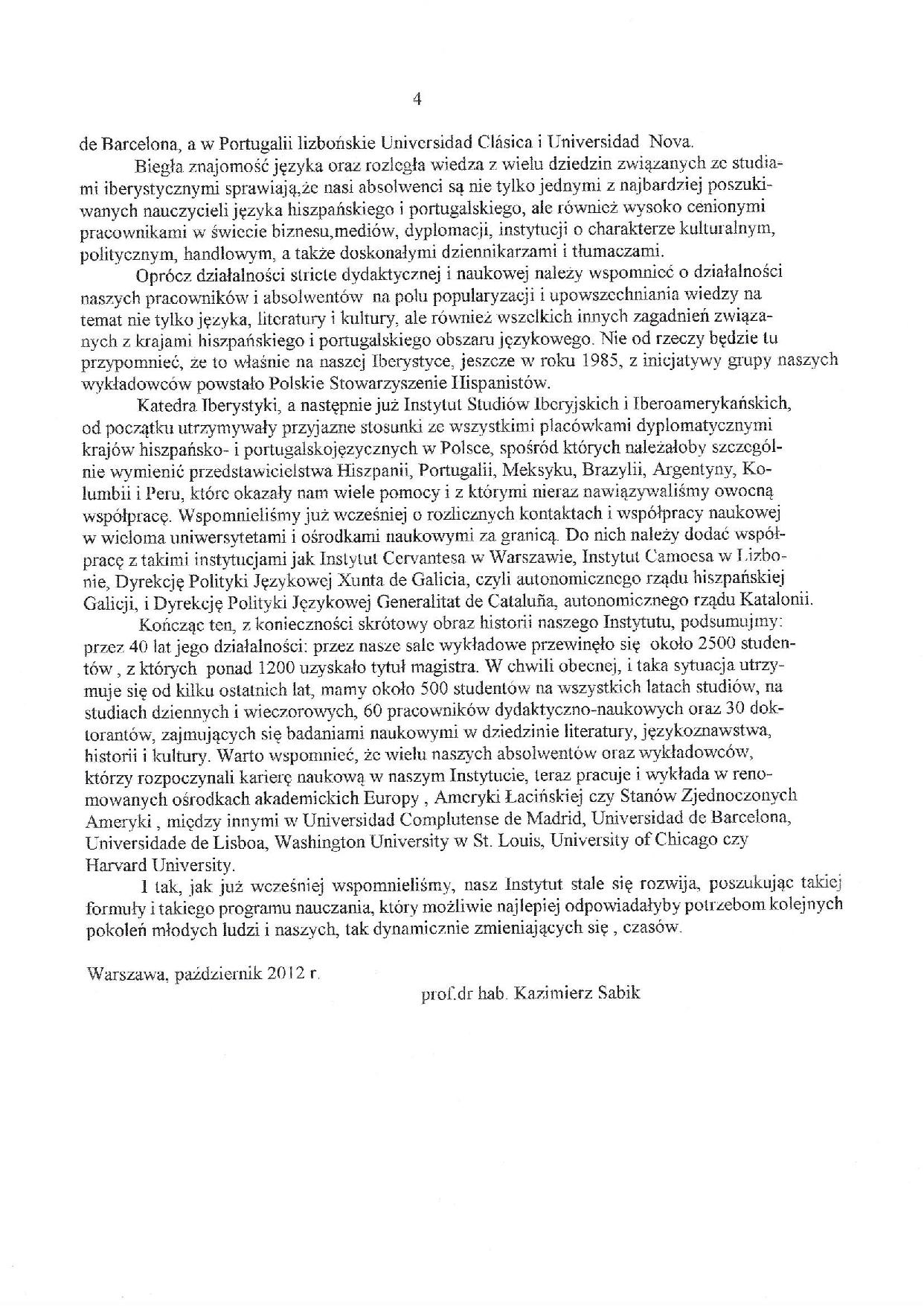 Z przeszło już 50-letniej historii Katedry/Instytutu przedstawiamy, z konieczności jedynie wybrane, dane i informacje. Pierwsze cztery pozycje to dwa referaty najstarszego pracownika, nestora warszawskiej i polskiej Iberystyki, obecnie emerytowanego profesora UW Kazimierza Sabika, najbliższego współpracownika prof. Karczewskiej-Markiewicz, ilustrowane programami obchodów 40. i 50-lecia Instytutu.