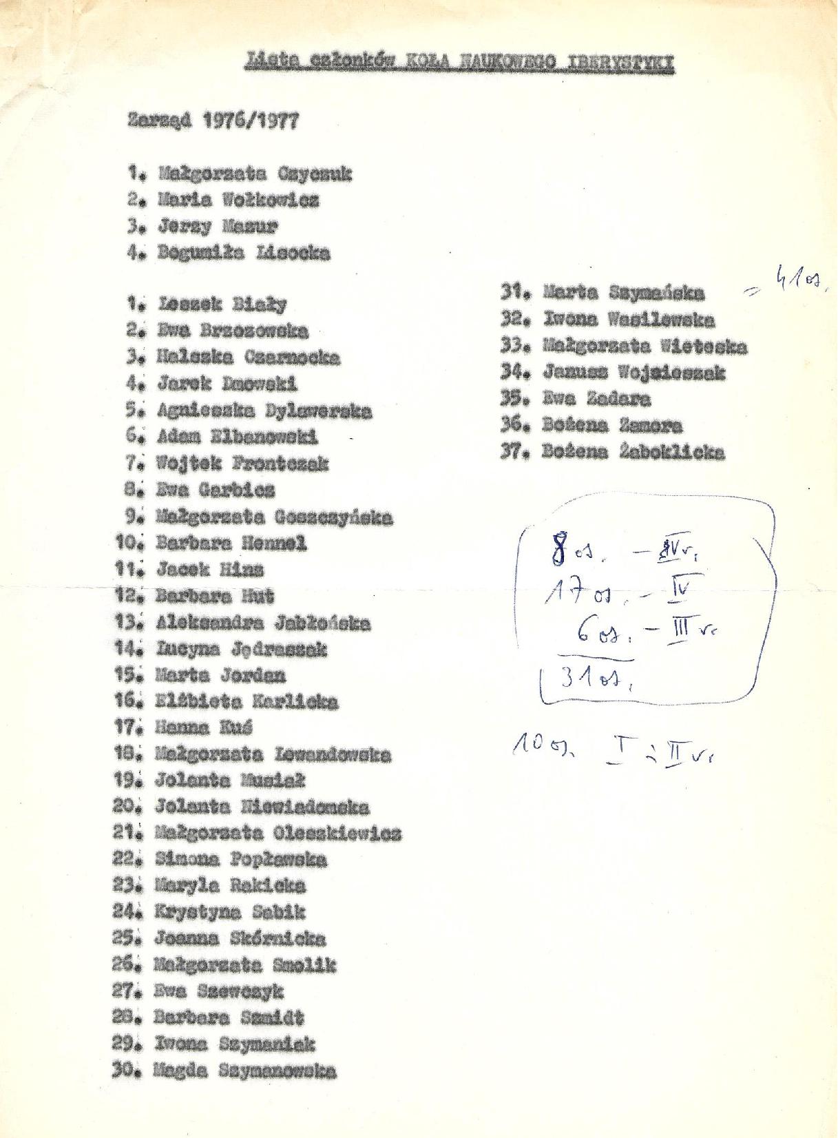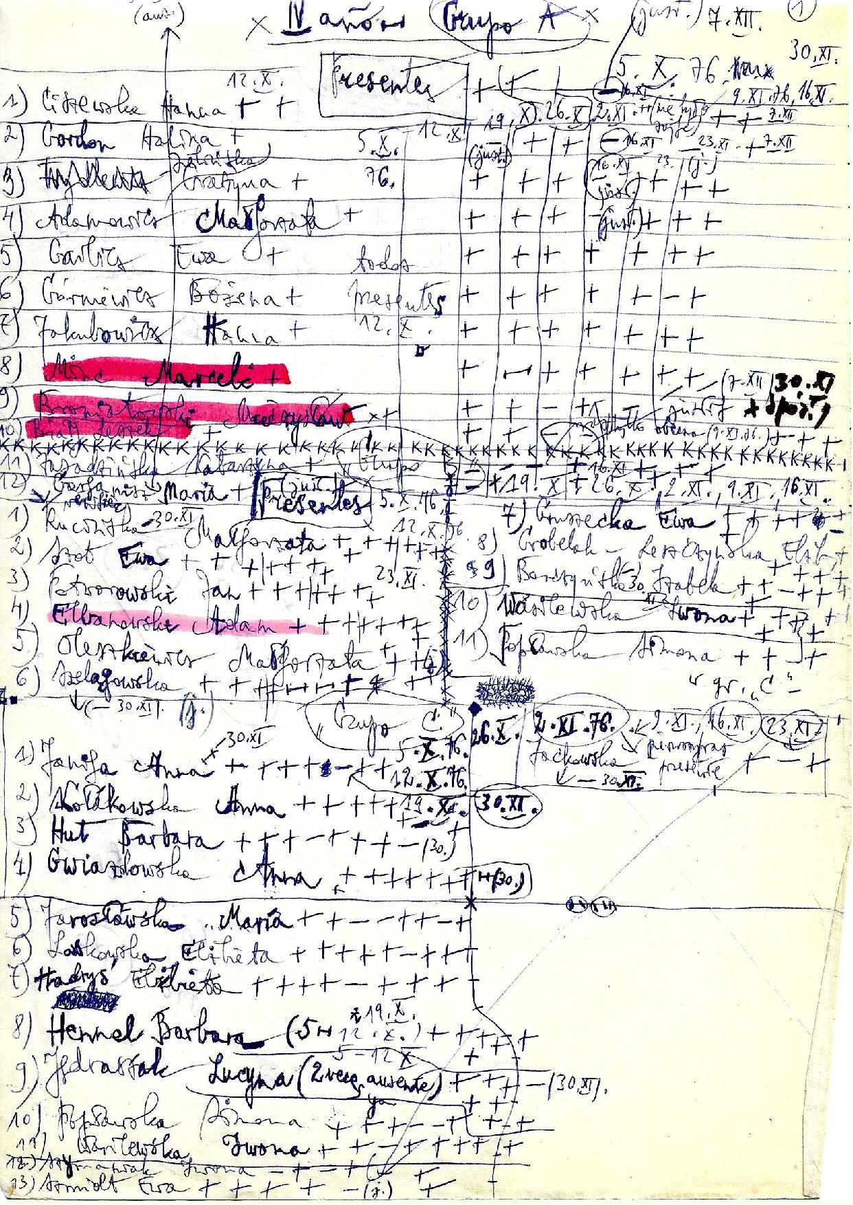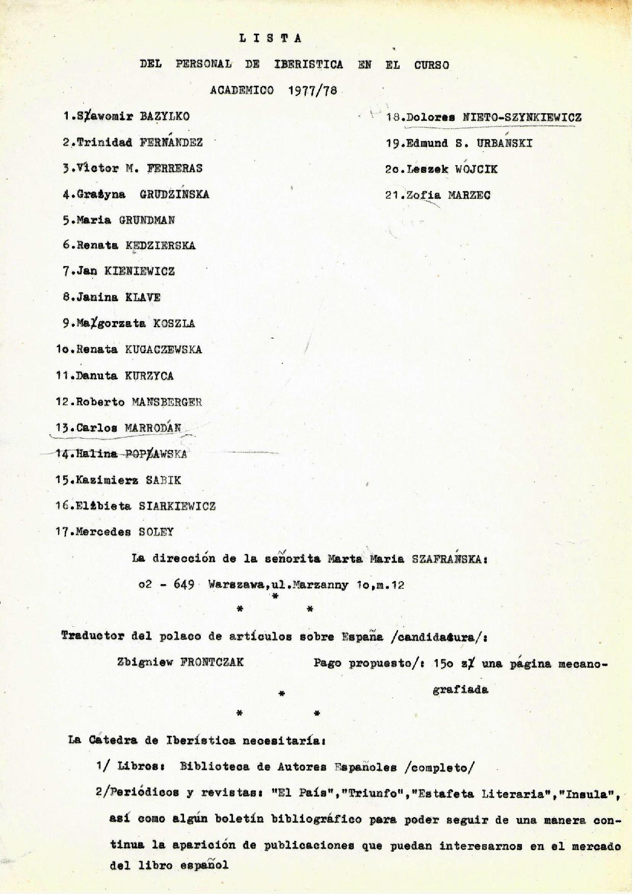 Następnie mamy listę pracowników Katedry w roku akademickim 1977/78 oraz roboczą listę obecności studentów III roku na lektoracie języka hiszpańskiego w roku ak. 1976/77, prowadzonym przez ówczesnego magistra Kazimierza Sabika, z zaznaczeniem nazwisk późniejszych wybitnych absolwentów, wymienionych na końcu tej podstrony.