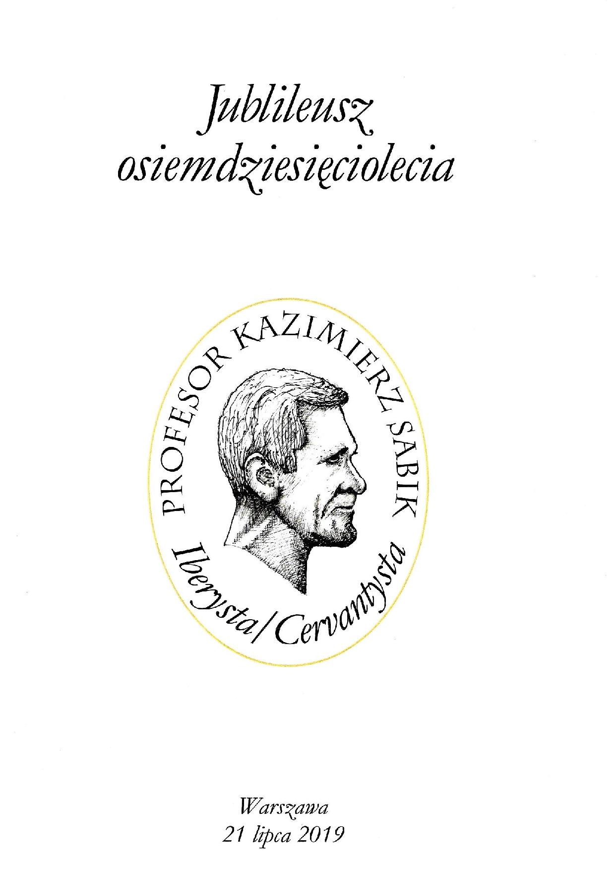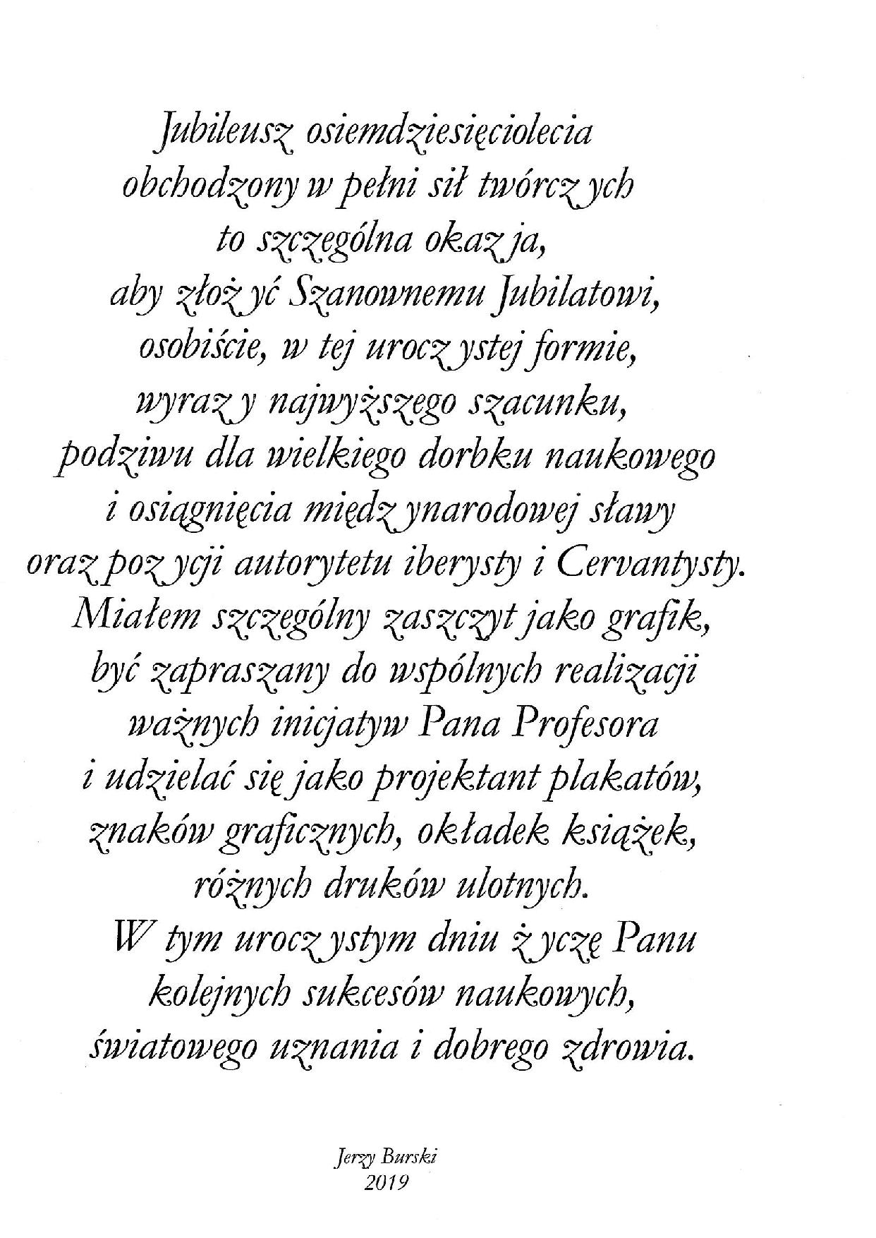 Tę przedostatnią podstronę otwiera portret i laudacja Profesora z okazji Jubileuszu, 80. Urodzin (21/07/1939 – 21/07/2019), ze szczególnym podkreśleniem graficznym zasług jako cervantysty, pióra wybitnego polskiego grafika, Jerzego Burskiego.