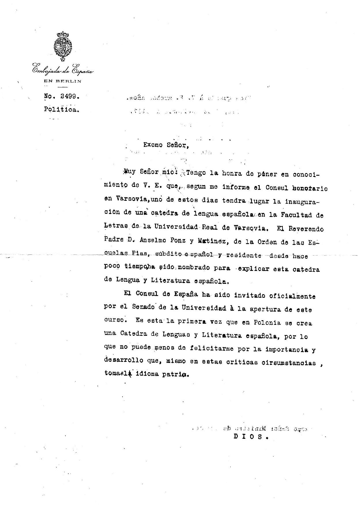 Podstrona nr 2 przedstawia program uroczystości z okazji rocznicy 100-lecia nauczania języka hiszpańskiego na Uniwersytecie Warszawskim, począwszy od listu Ambasady Hiszpanii w Berlinie, informującego o decyzji utworzenia lektoratu języka hiszpańskiego, rok przed odzyskaniem przez Polskę niepodległości.