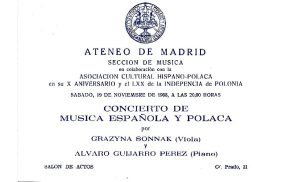 Zorganizowaliśmy tam szereg koncertów, wykładów, projekcji filmów czy promocji książek z takich okazji jak, m.in., 50. rocznica wybuchu II wojny światowej,, 10-lecie przywrócenia stosunków dyplomatycznych między Polską i Hiszpanią czy odzyskania przez Polskę niepodległości. Wydarzenia te uświetniały występy wybitnych polskich artystów, takich jak np. Piotr Paleczny. Informacje o tych wydarzeniach możemy śledzić na kolejnych zdjęciach umieszczonych na tej podstronie.