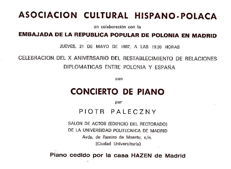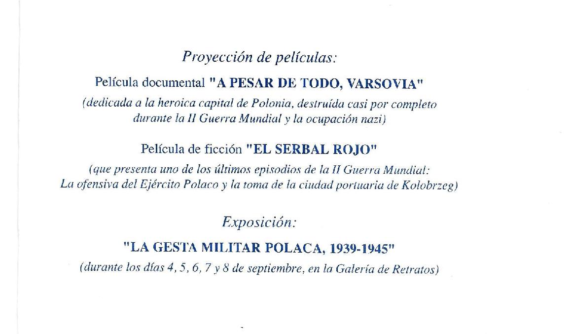Zorganizowaliśmy tam szereg koncertów, wykładów, projekcji filmów czy promocji książek z takich okazji jak, m.in., 50. rocznica wybuchu II wojny światowej,, 10-lecie przywrócenia stosunków dyplomatycznych między Polską i Hiszpanią czy odzyskania przez Polskę niepodległości. Wydarzenia te uświetniały występy wybitnych polskich artystów, takich jak np. Piotr Paleczny. Informacje o tych wydarzeniach możemy śledzić na kolejnych zdjęciach umieszczonych na tej podstronie.