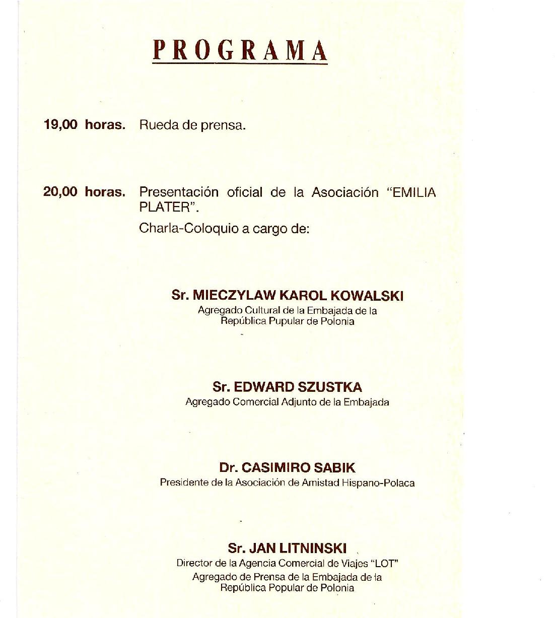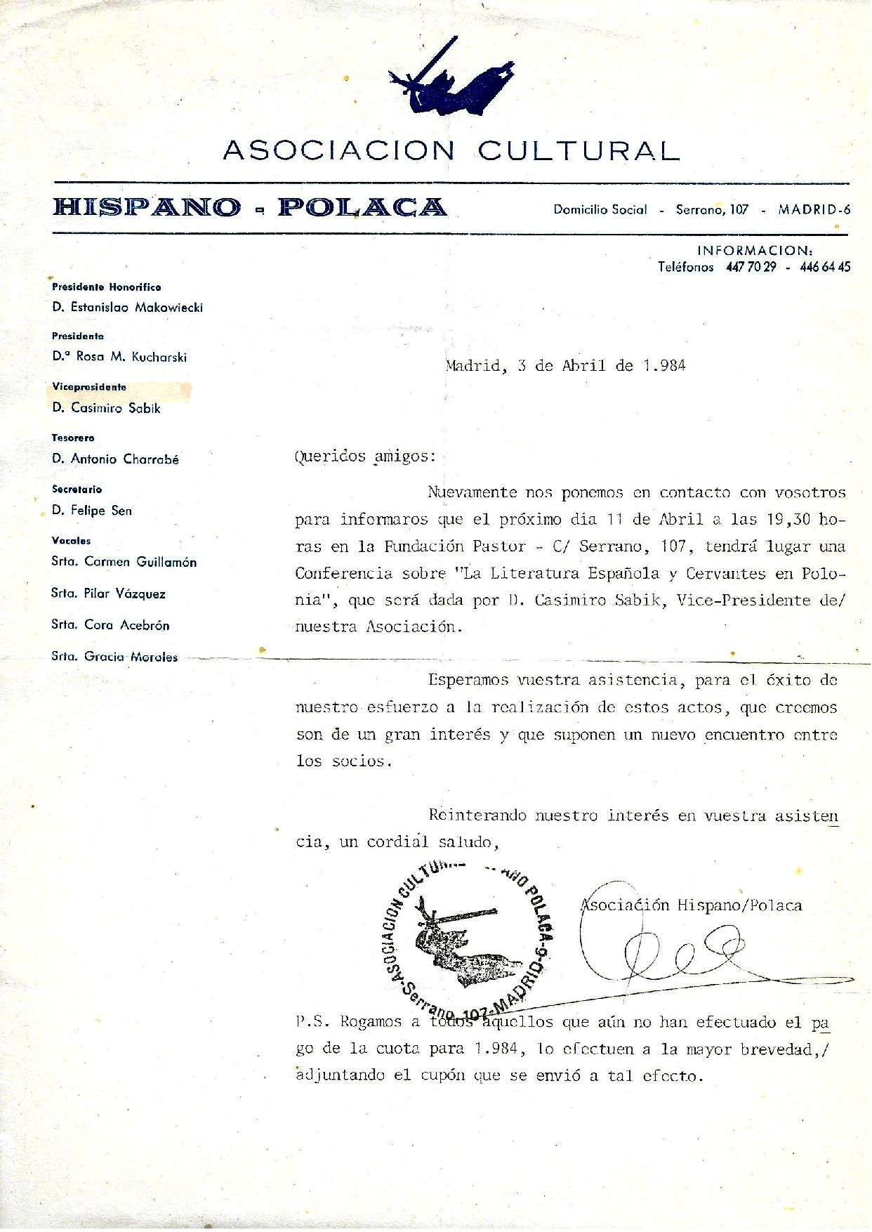 Fundamentem tej działalności, którą można by, górnolotnie, określić jako swego rodzaju misję kulturotwórczą, była funkcja najpierw wiceprezesa (od 1984 r.), a następnie prezesa (od 1986 do 1990 r.) Asociación, Cultural Hispano-Polaca, założoną przez polskie małżeństwo, osiadłe w Hiszpanii, Stanisława i Gabrieli Makowieckich w latach 60. XX w.