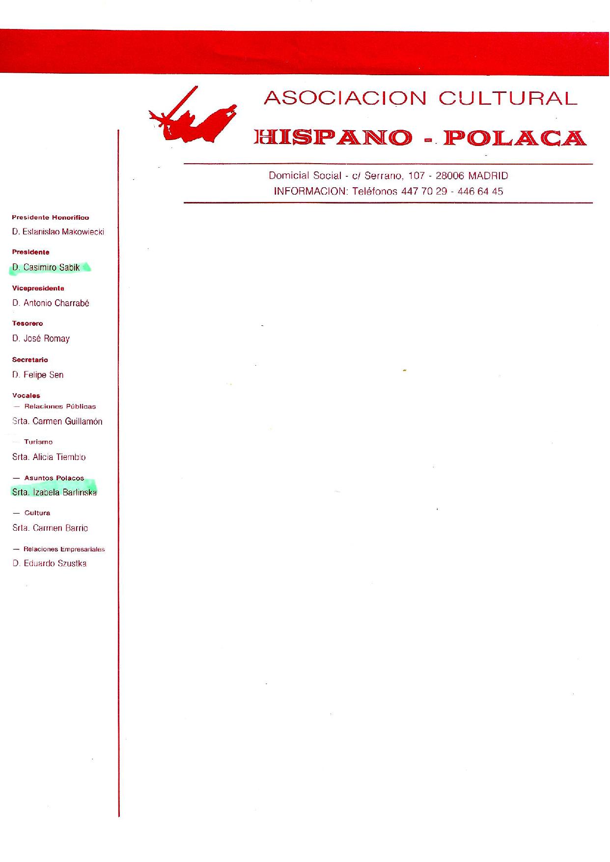 Skład Zarządu Głównego przedstawia zdjęcie, na którym obok jego członków widzimy Ambasadora RP w Madrycie, p. Mariana Renke oraz międzynarodowej sławy polityka i prawnika, prof. Joaquina Ruiza Jiméneza.