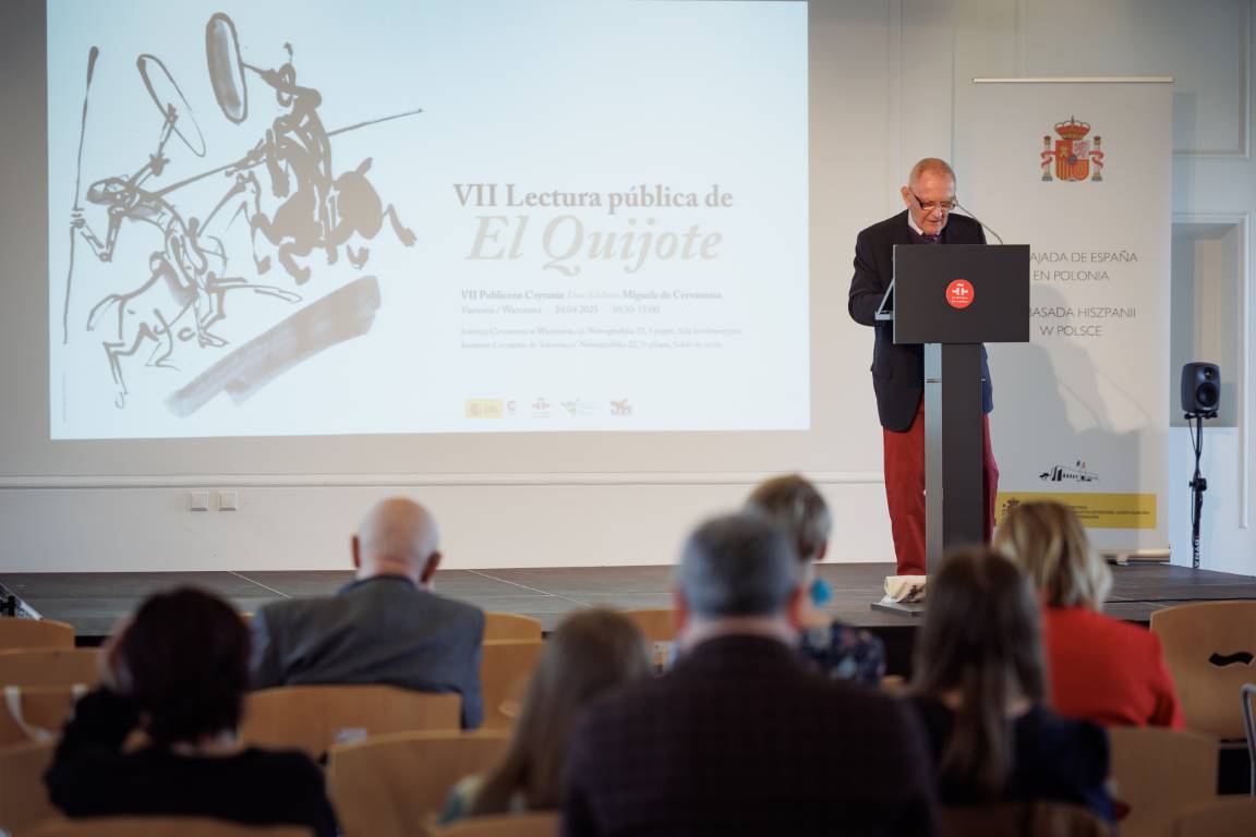 Zdjęcia z VII Publicznego Czytania “Don Kichota” w dniu 24 kwietnia 2025 r. (termin przełożony z dnia 23 kwietnia) w Instytucie Cervantesa w Warszawie, cyklicznej imprezy organizowanej wspólnie przez Instytut Studiów Iberyjskich i Iberoamerykańskich Uniwersytetu Warszawskiego, Ambasadę Hiszpanii w Polsce i Instytut Cervantesa w Warszawie.